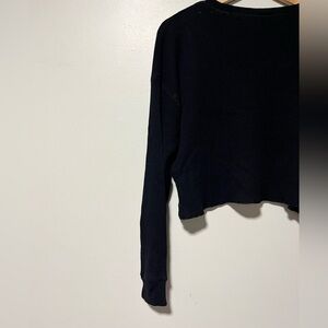 Stay effortlessly cool and cozy in this TNA black waffle knit cropped long sleeve in size M. Made from a soft cotton-Tencel blend, this thermal-inspired pullover offers a lightweight yet warm feel, perfect for layering or wearing solo. The raw-edge hem adds a casual, lived-in vibe, while the drop shoulders and ribbed cuffs create a relaxed, slouchy fit. Ideal for everyday wear, lounging, or pairing with high-waisted denim for a street-style moment.