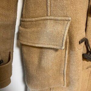 • Condition: Pre-owned, good vintage condition. Shows some signs of wear, including minor pilling/fuzziness typical of wool coats and some subtle marks (e.g., on the front near the toggles, and on the lower sleeves/cuffs).