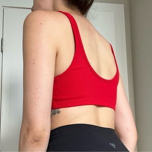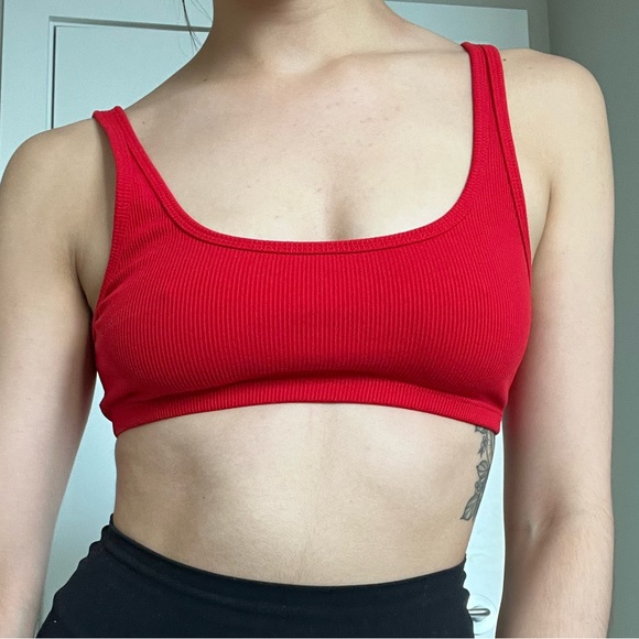 This is a bra top with a scoop neckline. It’s made with FormaRib — a luxe, high-stretch fabric with a second-skin feel and ribbed texture.