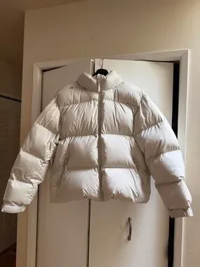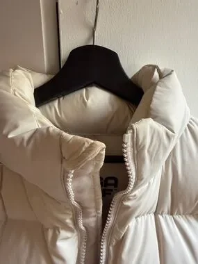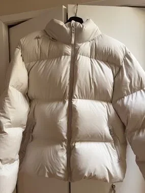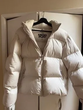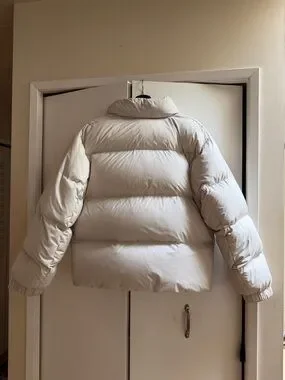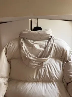 700+ down-filled Aritzia Mega Puff in light cream color. It has a packable hood that hides inside the collar!