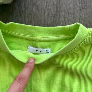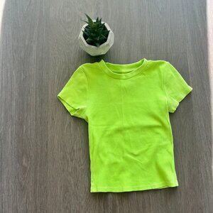 TNA Neon Green Ribbed Cropped T-Shirt (from Aritzia). In excellent condition with no visible flaws or defects (tears, stains, damage, pilling). See pictures for measurements :) Great for layering and every day wear!