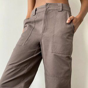 High rise utility joggers. They're ready to work. These are high-rise, cargo joggers with utility pockets and knee patches. They're made from strong, canvas-like cotton twill. They've been recently redesigned for a more streamlined look.