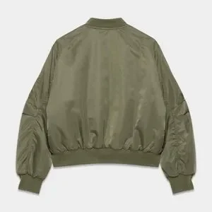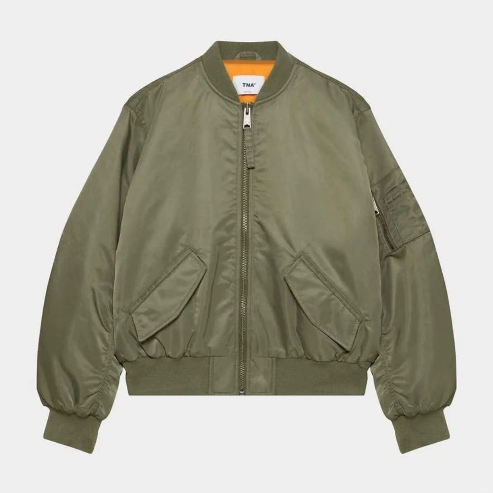 Stylish olive bomber jacket by TNA. Features ribbed cuffs and hem. Classic zip closure. Perfect for casual wear.