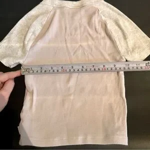 TNA Ribbed Raglan Baby Tee size 2XS in light beige/cream ribbed cotton blend. Short sleeve fitted baby tee with raglan sleeves and crew neckline. Soft stretchy ribbed fabric with slightly marled raglan sleeves for contrast. Chest measures 10”. Pre-owned condition with light signs of wear as shown in photos.