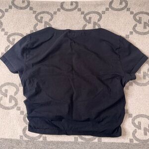 Chic black crop top with ruched sides. Stylish and versatile.