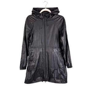 “Lightweight TNA by Aritzia “SaWatch” hooded windbreaker/rain jacket. Features full-zip front, adjustable hood with drawcord, two zip pockets, adjustable hem drawcord, and packable design. Ideal for travel, commuting, spring/fall rain or wind."