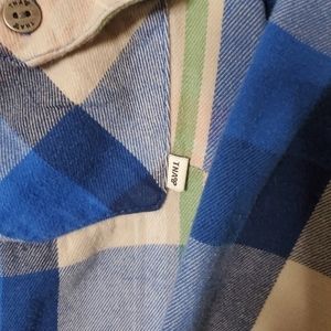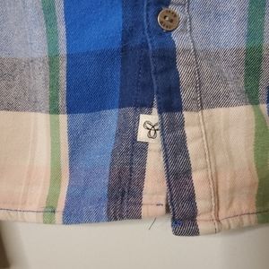 This TNA button up is a size small. It is a green, blue, and white plaid with metal buttons. It is super soft! There are some signs of wear on the flannel, but there are no stains or rips. Dimensions are taken by me with the shirt lying flat. Measurements may vary slightly.
