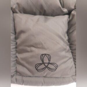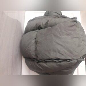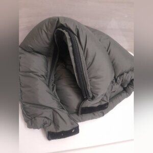 Stylish greenish gray puffer hood featuring an embroidered logo. Perfect for cold weather.
