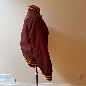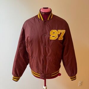 Oversized Stadium jacket (nylon varsity jacket) in contrasting burgundy and gold - classic varsity silhouette - drop shoulders, ribbed collar, cuffs and bottom with contrasting stripes, stitched TNA 97 on the left chest.