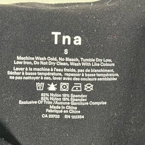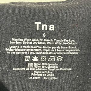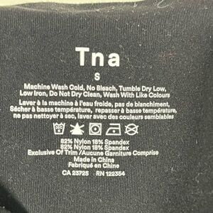 Elevate your athleisure style with these TNA high-rise leggings. Featuring a sleek black design with bold red and white stripes running down the sides, these leggings blend sporty aesthetics with comfort. Made from a stretchy nylon-spandex blend, they move effortlessly with you, whether you’re working out or lounging.
