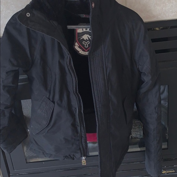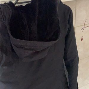 Size xs very used TNA jacket. Super comfortable and very warm. The inside has pink around the bottom and it is lined with faux fur. Inside pocket with a zipper and a spot for cards (I used it for my name and phone number in case it got lost). The outside pockets are magnetic and the hood is not detachable. Inside pocket has my name that I will try to get off before shipping.