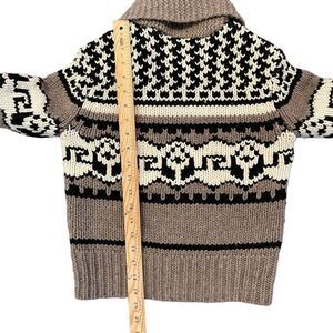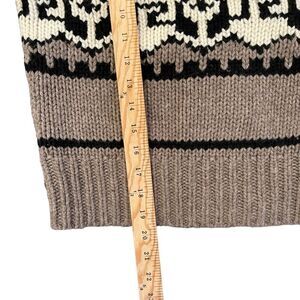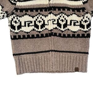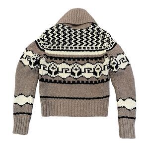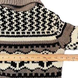 Aritzia TNA Cardigan Cowichan Wool Chunky Knit Full Zip. Black, Brown and Cream Nordic Sweater. Women's XXS. Shawl Collar neck. Full zip closure. Patch pockets. Ribbed cuffs and hem. Cozy, chunky knit. Slim fit. Warm, cozy 100% Lambswool. Very good used condition. Please see photos for approximate measurements. Please check measurements as some of these sweaters seem to run small.