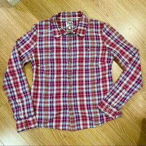 A timeless classic with a modern fit, this TNA flannel is done in a red, navy, and white plaid with a tailored, slim silhouette. Features a button-up front, collared neckline, and a soft, lightweight feel — perfect for layering or wearing on its own. A must-have staple for casual, preppy, or grunge-inspired looks.