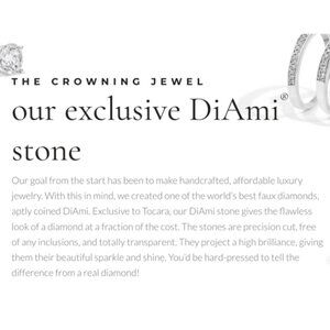 Our goal from the start has been to make handcrafted, affordable luxury jewelry. With this in mind, we created one of the world’s best faux diamonds, aptly coined DiAmi. Exclusive to Tocara, our DiAmi stone gives the flawless look of a diamond at a fraction of the cost. The stones are precision cut, free of any inclusions, and totally transparent. They project a high brilliance, giving them their beautiful sparkle and shine. You’d be hard-pressed to tell the difference from a real diamond!