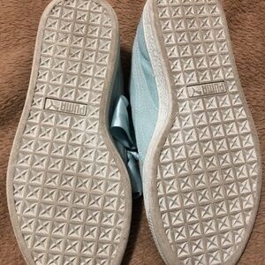Preloved. Light blue suede material PUMA with dainty satin shoe laces. Signs of wear. Please see pics. Insoles are clean. Spot on front sneaker rubber lining. Some negligible minor dirt on areas pictured. Overall good condition. For women size 7.5 US. Cheers!