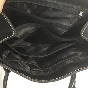 Features: Inside zipped pocket, inside zipped section, 2 inner pouches, silver hardware, lock and key accents.