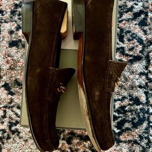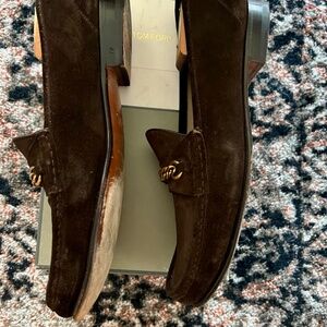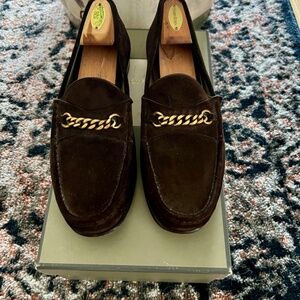A pair of TOM FORD York Brown Suede Loafers with signature TF Gold Chain accent. Retailed for $1195.
