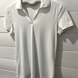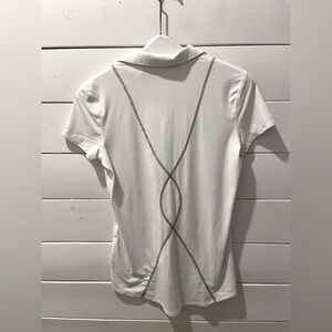 White activewear top featuring a split-neck polo collar and short sleeves. Designed with contrasting orange stitching at the hem and curved seams on the back for a flattering silhouette. Stretchy and breathable. Excellent condition.