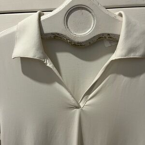 Haut de sport blanc avec col polo ouvert et manches courtes. Coutures contrastantes orange au bas et coutures incurvées au dos pour une silhouette flatteuse. Extensible et respirant. En excellente condition.