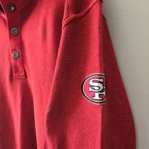 Amazing 49ers sweater from Tommy Bahama. Thickknit cotton. Branded 3/4 snap closure. 49ers sleeve. Grid iron brand tag.