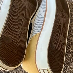 Cute and comfy slip-on shoes with blue and white pinstripes, mustard yellow heel, and tropical floral lining. Easy to wear with stretch sides and cushioned soles. Perfect for summer and beach days!