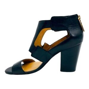 Black with gold hardware , leather , open toe , wide t-strap , buckle up, chunky heeled sandals / shoes by Tommy Hilfiger