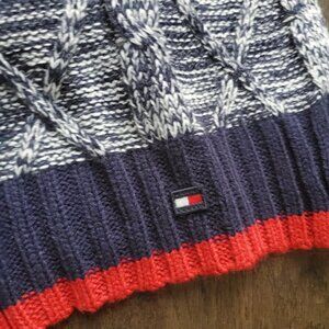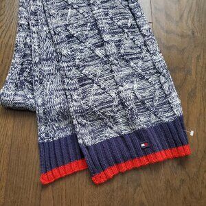 TOMMY HILFIGER Cable Knit Scarf Heathered Navy Blue & Red Trim Embroidered Logo