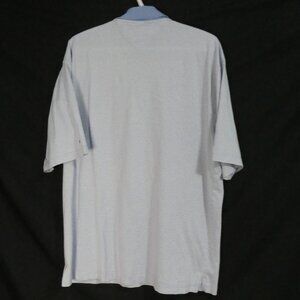 Light blue short sleeve polo shirt with a contrasting solid blue collar and subtle stripe pattern