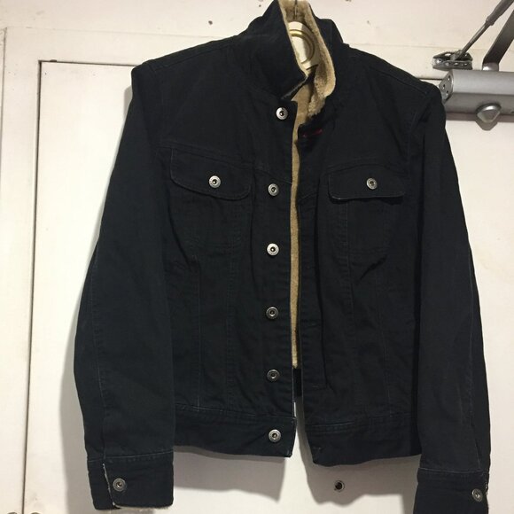Tommy Hilfiger Jean Jacket, Lightweight Size XL, Color Black Wash, Tan, 100% Cotton, Sherpa Lined, Breast Pockets, Side Pockets, Closure Button Down, Good Condition, Relaxed Fit, Great Look, Great Fit.