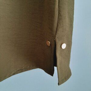 • Short puff sleeve, lightweight pullover v-neck dress in green with metal capped tie belt and small side slits.