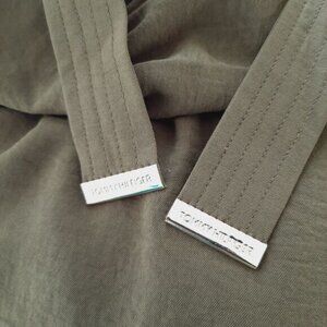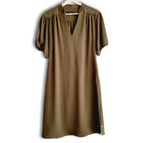 • Short puff sleeve, lightweight pullover v-neck dress in green with metal capped tie belt and small side slits.