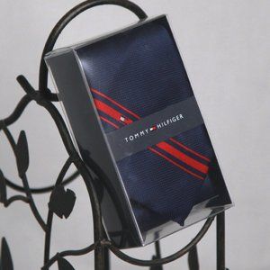 This sharp looking dark blue tie with a red stripe is made of 100% Polyester. It has just the right amount of shine that gives it that sharp crisp look that pops but remains classy. I love wearing similar coloured ties with blue or red pants or white dress shirt when I want to keep it simple but have it standout. This particular tie has never been out of its package.