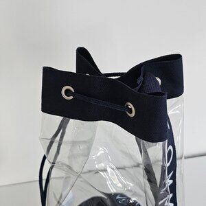 Brand: Tommy Hilfiger Clear PCV Shoulder Bag Bucket style with top load and draw string closure. Canvas bottom and top trim. Round bottom can stand on own. Adjustable shoulder strap.