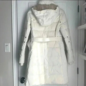 Tommy Hilfiger long white winter coat with belt and removable hoodie.