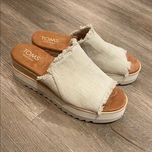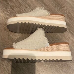 This stylish platform wedge features frayed denim uppers, eco-friendly OrthoLite® footbeds, and jute-wrapped EVA soles with sawtooth tread for traction.