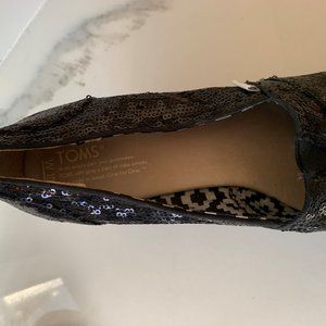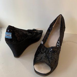A sparkly slip-on black sequin wedge heel with a soft leather foot bed and durable rubber sole.