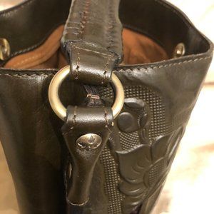 This chic Patricia Nash original bucket bag is as functional as it is elegant. The ‘Otavia’ (style P682244) is 100% full-grain tooled leather in a rich dark olive tone (almost brown) with intricate artisan cut-outs that display a metallic background. It is adorned with leather tassels, signature brushed metal hardware and protective metal feet.