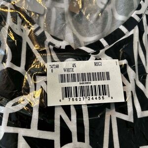 TOP, BLACK & WHITE, SIZE 4X, GEOMETRIC PRINT, SIDE MESH PANELS, SIDE SLITS, SOFT JERSEY, SCOOP NECK, PENNINGTONS, IN ORIGINAL BAG, TAG ON, NEVER WORN