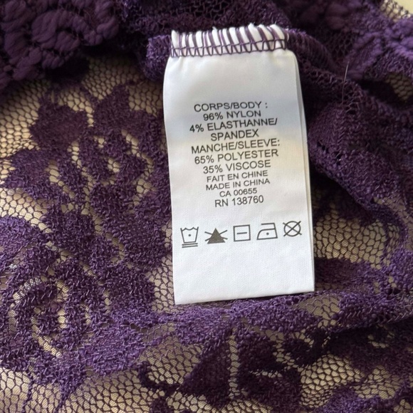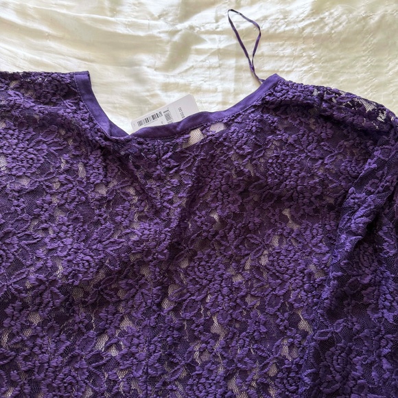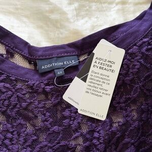 TOP, FLORAL LACE, DEEP PURPLE, SIZE 4X, LONG LACE SLEEVES WITH PLAIN CUFFS, ALL OVER EMBROIDERED, LONGER IN BACK, ADDITION ELLE, IN ORIGINAL BAG, TAGS ON, NEVER WORN