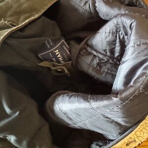 Desc: Fur trim zips off as shown in pic / Inner fleece lining buttons off for lighter seasons. / Hood is NON-removable. / Clasp-closure hook at top to hold the lining in place as shown. / Has pull string on innards to synch up for shaping.