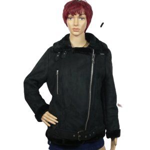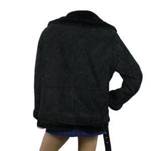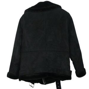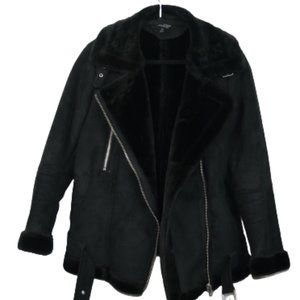 Topshop black exposed zipper jacket 1 zipper pocket 2 front pockets belts around the lower jacket Outer exterior Polyester 100% & faux fur