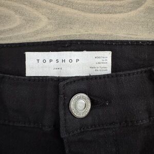 Stylish black TopShop Jamie jeans with a distressed hem.