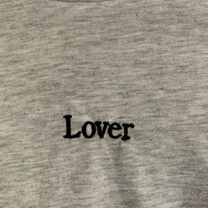 Grey tee embroidered with “Lover” on front and arrow through heart on left sleeve. 68% polyester, 32% viscose. Machine wash inside out, hang to dry.