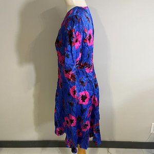 An artistic floral print and tonal front buttons add graceful elements to a stem-baring frock framed with voluminous puff sleeves.