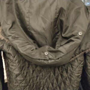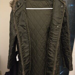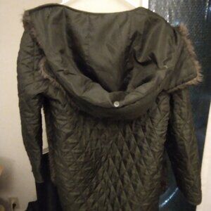 TOPSHOP LONG LINE QUILTED OLIVE GREEN WINTER COAT LINER IN EXCELLENT CONDITION, HAS A FAKE FUR INSIDE THE HOOD AND ALL ALONG THE FRONT. SIZE US 4, UK 6.