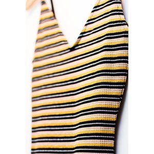 Vibrant colourful striped multicoloured bodycon dress with v-neck line. Perfect styling for daytime dressing with trainers or night time with heels.