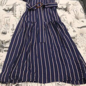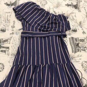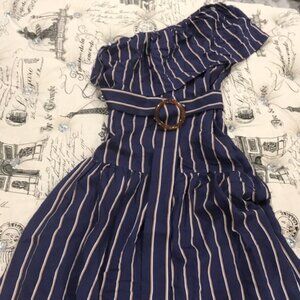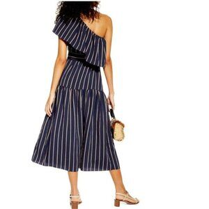 Elevated charm defines this striped midi styled with a ruffled one-shoulder neckline, waist-defining belt and flouncy hem.