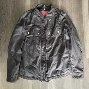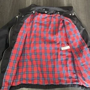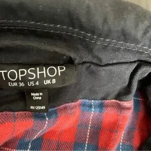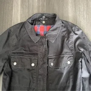 Utility jacket. TOPSHOP brand. Size US 4; true to size. See all photos for measurements. Dark navy blue lined with red/blue/white plaid on the inside. Lightweight material perfect for spring, summer or fall. Silver hardware. Many functional pockets. Adjustable drawstrings on hem. Used but in very good condition; no holes or stains.