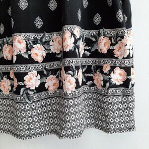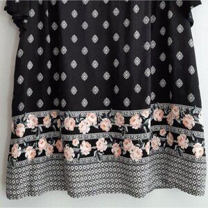 • Short flutter sleeve crew neck top in black with pink rose flower print hem.