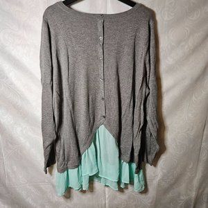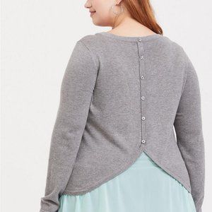 A sweater that shows you're a mermaid at heart. A contrast hemline gives the illusion of layering in this crew neck 2fer sweater that's complete with a non-functional button back.